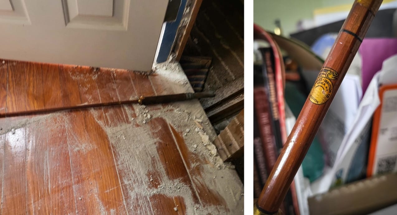 I reached into the wall cavity to clean out debris, and found the butt section of an old fly rod - research revealed it to be a Horrocks Ibbotson split cane Bamboo rod from the 1920's!