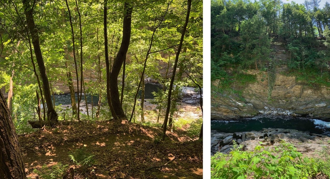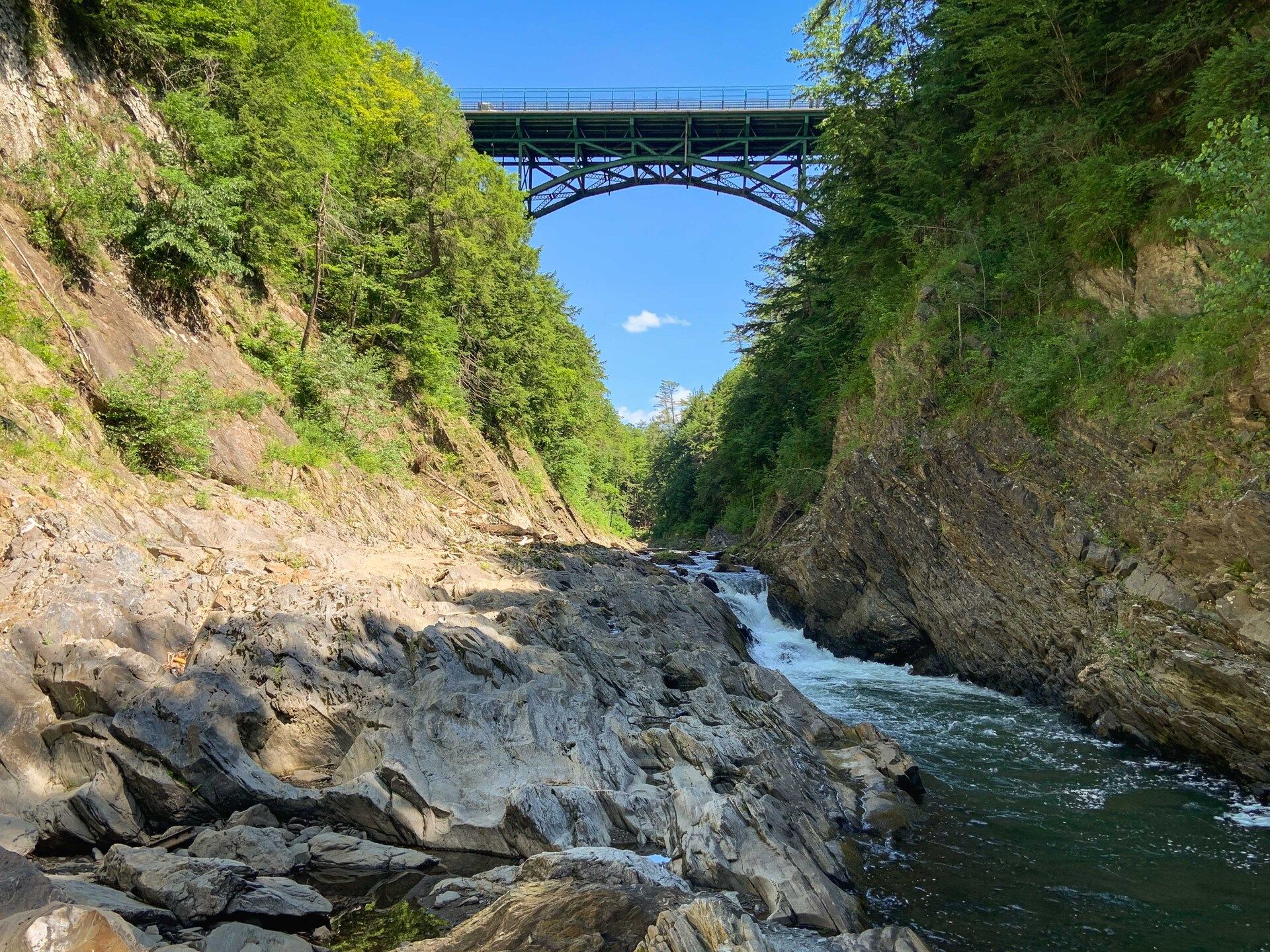 Most people don’t see the gorge from the bottom. During the summer - and especially foliage season - when the leaves become the yellows, reds, and oranges of a land that seems to have been created by Dr. Seuss, mobs of folks gather on the bridge spanning the 165-foot-deep chasm to see the spectacular view. They arrive by car and bicycle. And buses that are so big they look like new buildings erected in the parking lot. With cameras and tour group IDs hanging from their necks, they shuffle back and forth across the busy road to see the scenery. There is a snack bar and gift shop selling T-shirts, souvenirs, and specialty foods, including a line of meat seasonings with clever names like “Bull Shit” and “Chicken Shit.” During peak times, driving through the area as a part of daily life is maddening.
